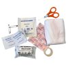 Obsahuje: 4 ks čistících ubrousků k dezinfekci, 1 ks balení s čtverci gázy na zakrytí rány, 1 ks obinadlo 5 cm × 4,5 m, 5 ks náplastí, 1 ks mini nůžky, 2 ks zavírací špendlík, 1 ks fixační lepící pásky, 1 ks trojúhelníkový obvaz pro podporu poraněné ruky, návod k použití, bílé pouzdro na zip EMPOLAS.